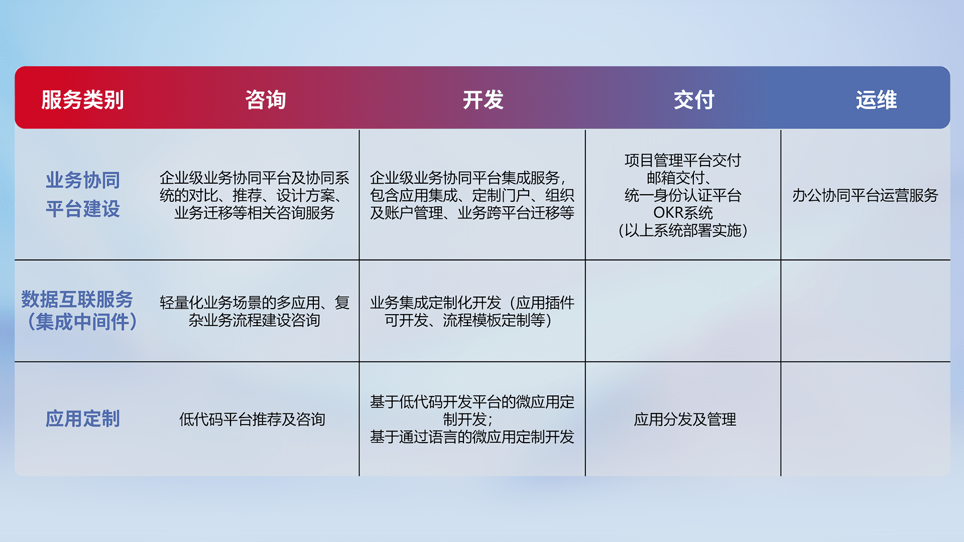 针对钉钉、、企微、、IDaas等平台级产品提供产品的规划、、方案、、交付、、、、定制化开发等服务,,,,实现如统一协同办公、、、智能客户服务、、混合会议管理、、、智能数据查询、、、等业务场景,,实现数字化转型。。