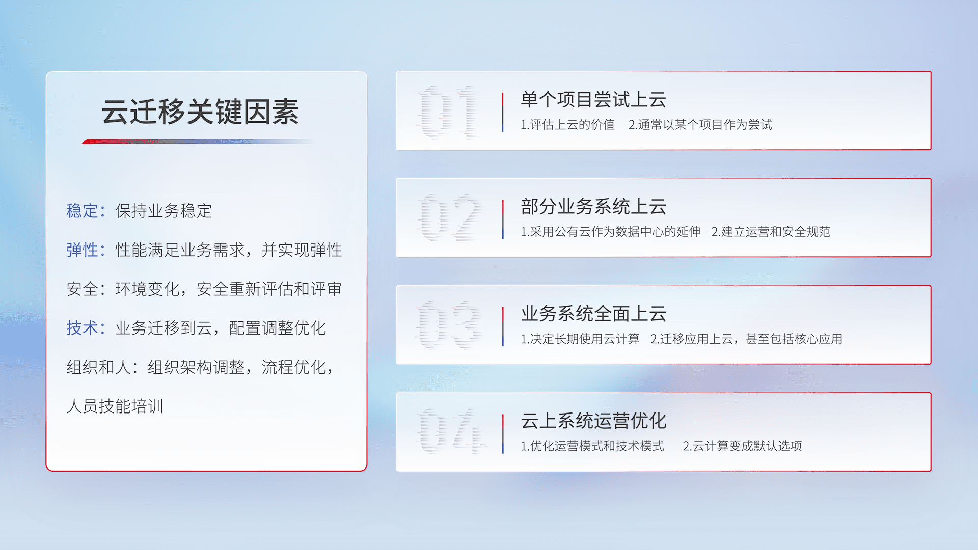 结合实际业务,,从规划设计、、云平台选型、、、云原生改造、、数据迁移、、集成交付,,迁移全过程为客户识别最佳上云路径,,,,做好风险识别管理,,,,设计网络架构、、、、身份权限、、安全审计合规、、、、操作审计、、、、日志审计、、、、监控告警策略、、、、多站点容灾设计等,,,对云上基础设施进行整体规划,,提升IT治理水平,,,以满足弹性、、高可用、、高性能的需求。。。
