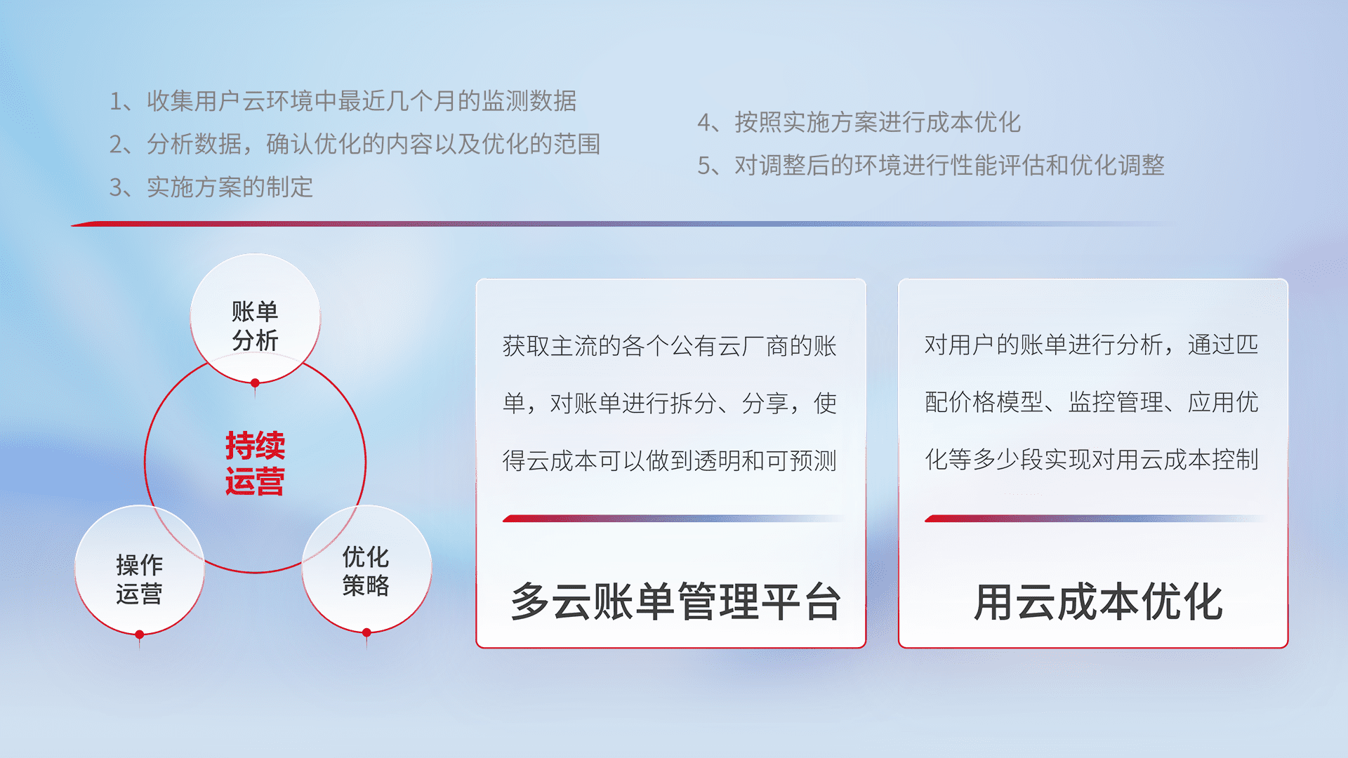 通过多云纳管,,以统一的资源数据模型把客户的云资源进行抽象和封装,,进而实现对多云资源的统一操作,,保障云资源管理的可靠性、、、、稳定性与可用性。。。。量身定制化运维内容,,配置、、、开发运维、、、、补丁管理、、、、备份、、、、监控、、、认证和访问管理、、、审计和日常巡检等,,,保障在用云过程中的可靠度,,,,稳定度以及高可用率。。。