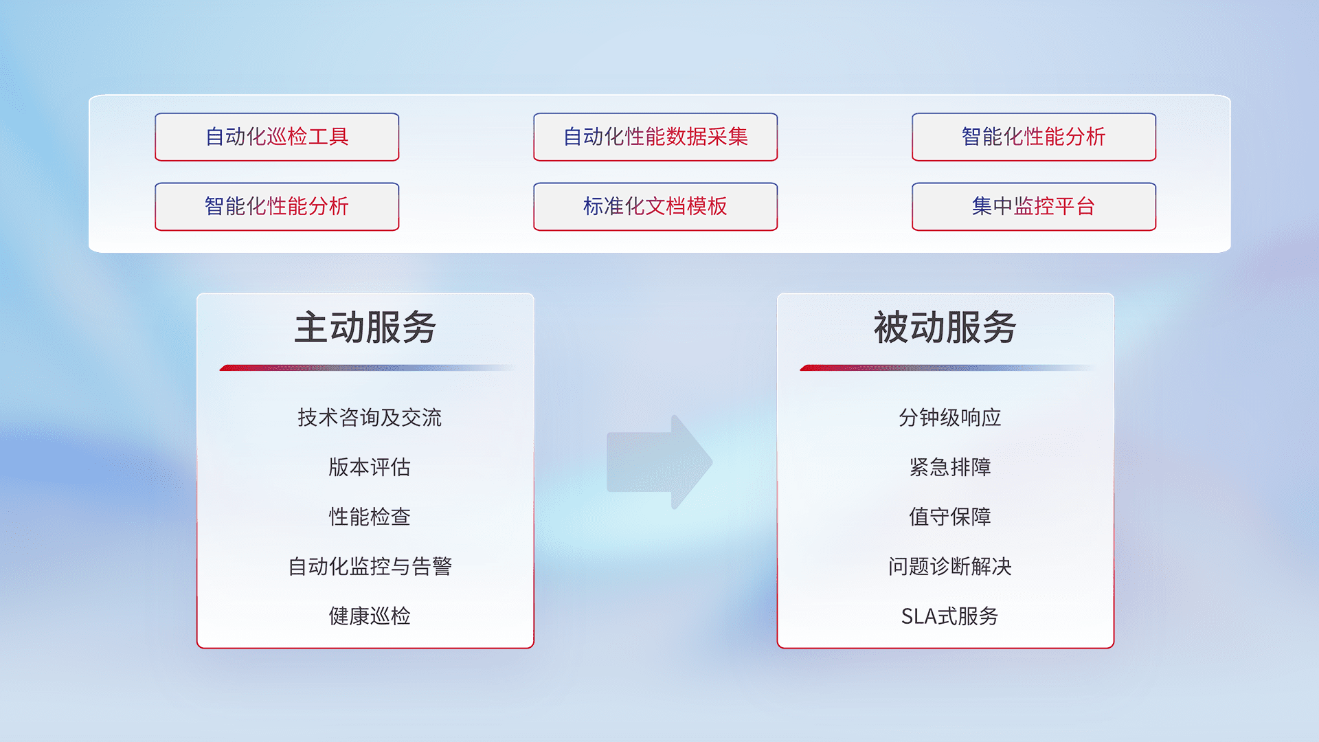 智能化工具和标准化文档,,,保障服务质量,,,,提供主动服务(包含技术咨询、、版本评估、、性能检查、、自动化监控与告警、、、健康巡检)和被动服务包含(分钟级响应、、、、紧急排障、、、值守保障、、、问题诊断解决、、、SLA服务)。。