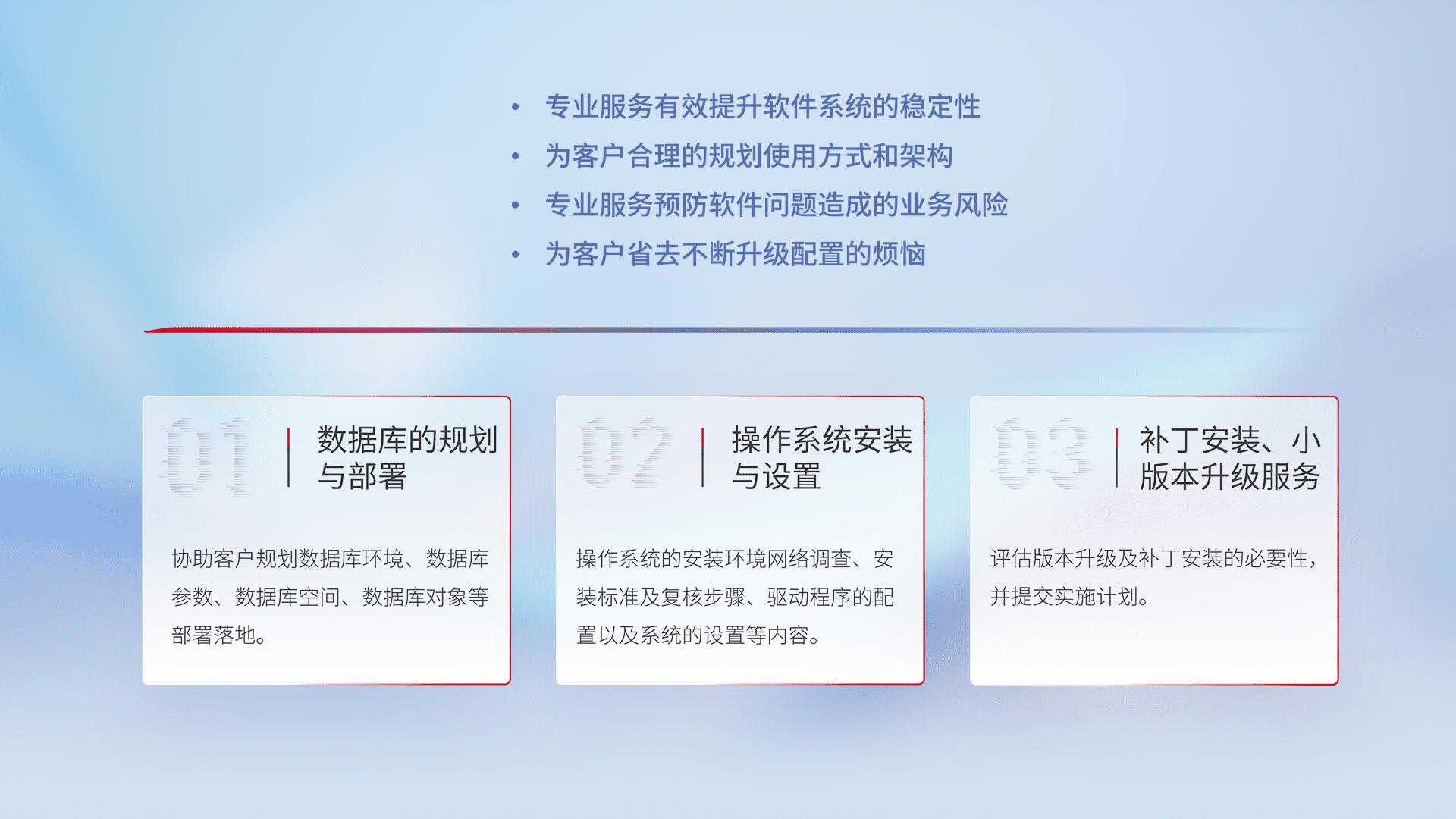 为客户提供软件规模升级、、、、快速部署、、按需配置的专业服务,,,从数据库的规划与部署到操作系统的安装与设置,,,再到补丁安装和小版本升级提供支持。。。。