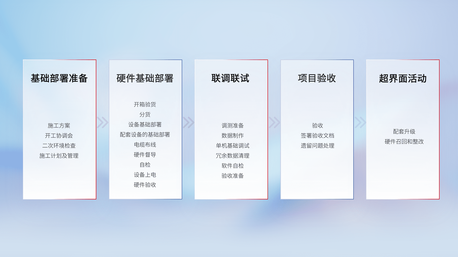 从基础部署准备、、硬件基础部署、、、、联调联试、、、项目验收、、、越界面活动的全过程可追溯,,保证施工质量和进度。。。